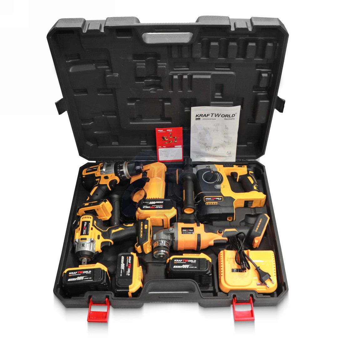 Trusă de scule cvadruplă cu polizor unghiular, cheie, compresor și șurubelniță cu impact. 4 baterii și 1 încărcător rapid